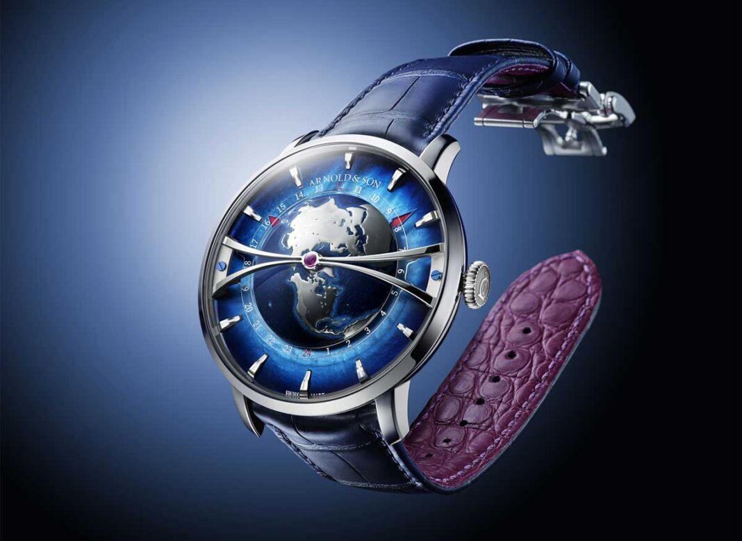Continuing to explore streamlined design, Arnold & Son emphasises the precious, elegant and modern character of its Globetrotter timepiece. The appliques indexes on two planes are faceted and crafted from 18-carat gold with a touch of Super-LumiNova. The lower part of the dial encompassing the world map is in mother-of-pearl tinted in graduated shades of blue.